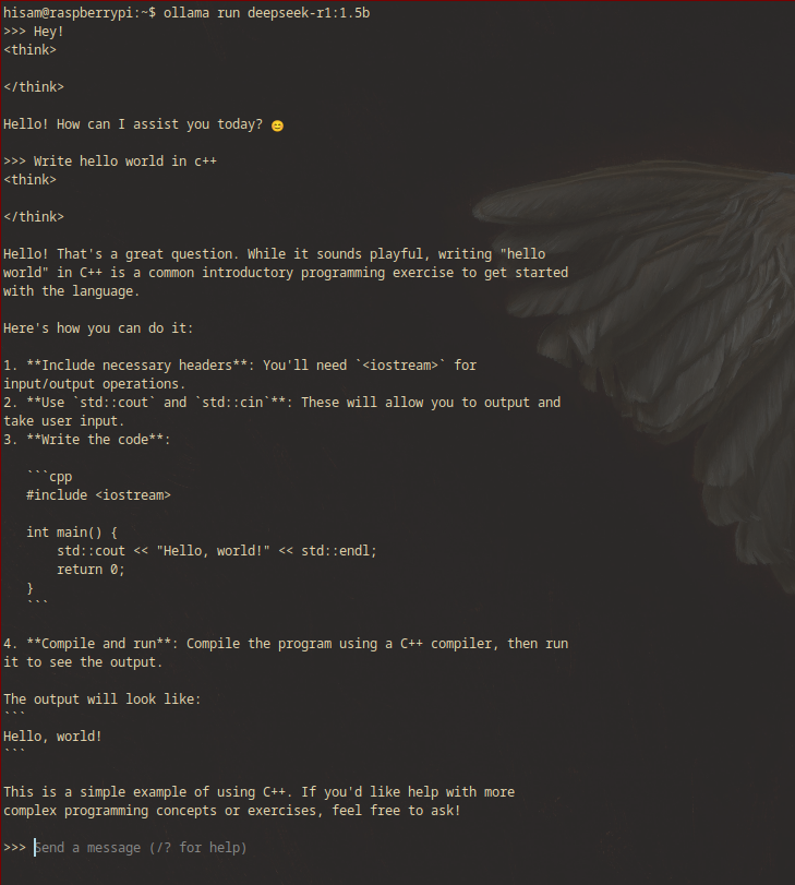 You have successfully installed and executed DeepSeek-R1 1.5B on your Raspberry Pi 5. This demonstrates the power of open-source AI, making it possible to run advanced models on small-scale devices. If you encounter performance issues, consider optimizing your setup or offloading computations.
